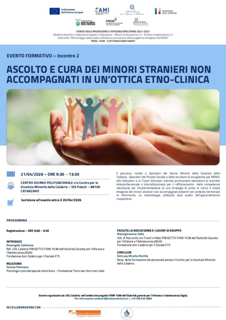L’evento formativo per gli operatori degli enti locali e del terzo settore della regione Calabria, rivolto a operatori dei servizi minorili della Giustizia della Calabria, operatori del privato aociale e delle strutture di accoglienza per Msna, alle istituzioni e ai tutori volontari, promuove attraverso lo scambio interprofessionale e interistituzionale il rafforzamento delle competenze necessarie per l’implementazione di una strategia di presa in carico e tutela integrata dei minori stranieri non accompagnati presenti nel contesto territoriale di riferimento. La metodologia utilizzata sarà quello dell’apprendimento cooperativo. Sono previsti 2 cicli formativi di 3 incontri.