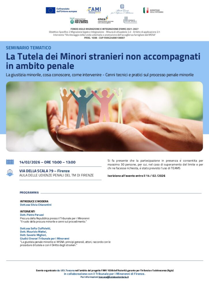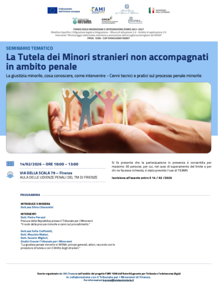 “La giustizia minorile: cosa conoscere e come intervenire. Cenni tecnici e pratici sul processo penale minorile.” La Dott.ssa Silvia Chiarantini, Presidente del Tribunale, introdurrà il tema. Interverranno anche altri giudici, con particolare attenzione ai MSNA e al ruolo dei Tutori Volontari.