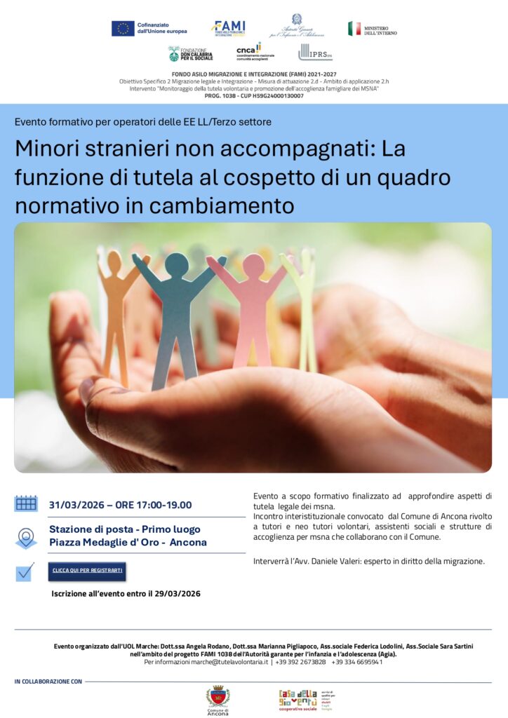 L’evento formativo convocato dal Comune di Ancona, rivolto ai propri tutori volontari e neo tutori volontari, ai Coordinatori delle strutture di accoglienza per Msna, alle assistenti sociali del Comune di Ancona, nella Regione Marche, rappresenta un approfondimento sulla tutela legale dei Msna. In una cornice interistituzionale volta a favorire la comunicazione e lo scambio tra tutti gli attori del sistema locale di tutela volontaria.
