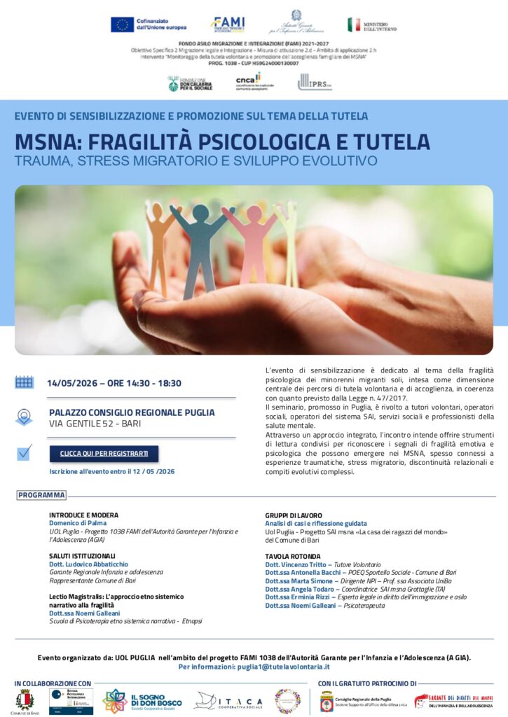 Il seminario, promosso in Puglia, è rivolto a tutori volontari, operatori sociali, operatori del sistema SAI, servizi sociali e professionisti della salute mentale.