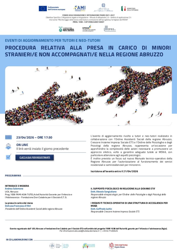 L’evento di aggiornamento rivolto a tutori e neo-tutori realizzato in collaborazione con l’Ordine Assistenti Sociali della regione Abruzzo, Crescere Insieme Impresa Sociale ETS e l’Ordine delle Psicologhe e degli Psicologi della regione Abruzzo, rappresenta un’occasione per approfondire la complessità delle azioni necessarie a promuovere un approccio olistico, volto a garantire adeguate tutele ai MSNA, con particolare attenzione agli aspetti psicologici.